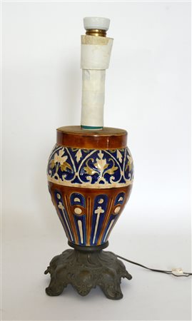 Lampada ad olio in metallo e ceramica decorata a motivi vegetali (h cm base 28) (lievi difetti)