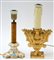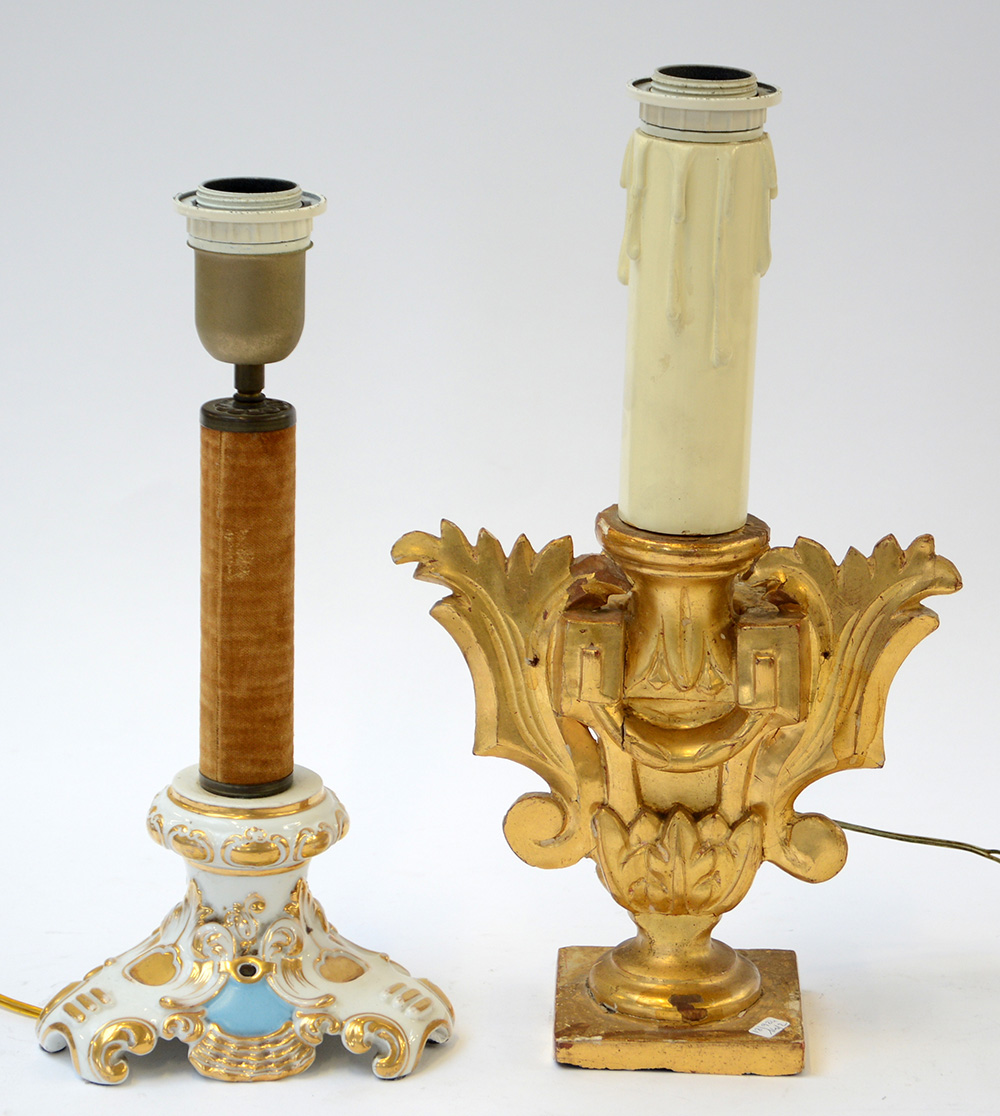 Lotto di due candelieri ad una fiamma, uno con base in porcellana decorata a fregi dorati ed una in legno intagliato e dorato, secolo XIX (difetti)