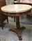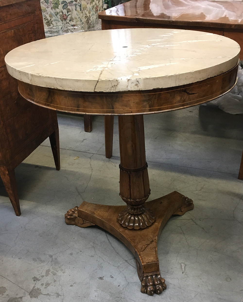 Tavolo di forma circolare lastronato in radica di noce e filettato in legno chiaro. Gamba a colonna poggiante su base tripode terminante a piedi ferini. Piano in marmo. Secolo XIX (d. cm 74,5) (difetti)