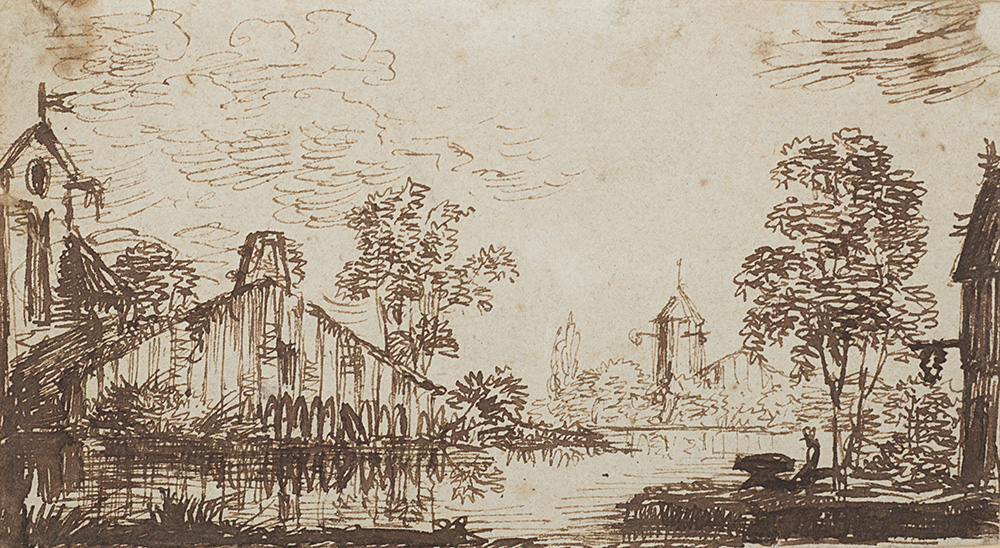 Artista del nord Europa dell'inizio del secolo XVIII "Paesaggio con fiume" penna e inchiostro bruno su carta, inserito in passepartout (mm 78x140) (difetti)