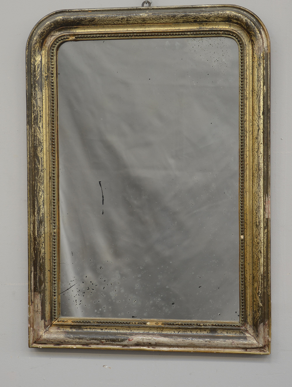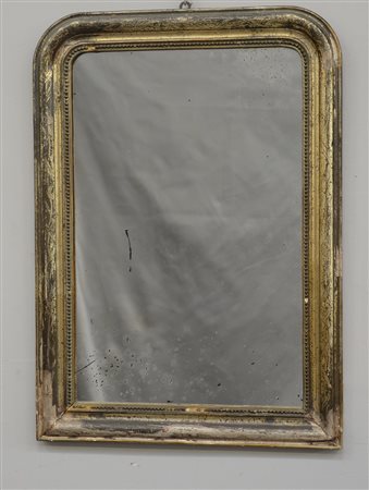 Specchiera in legno dorato a mecca e bulinato, profilo interno decorato a perlinature, fine sec. XIX (cm 88x62)(difetti)