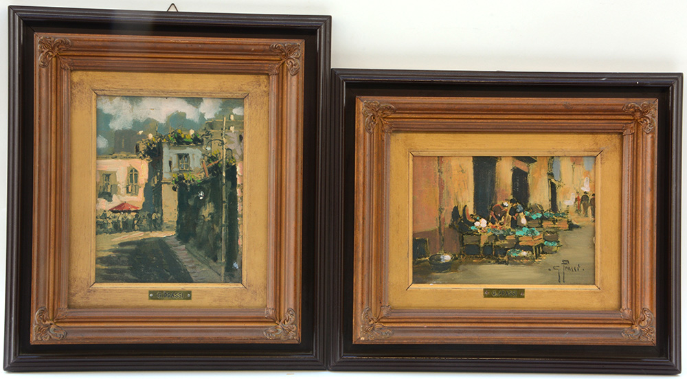 G. Prassi Coppia di dipinti ad olio su cartone raffiguranti scene di mercato,...