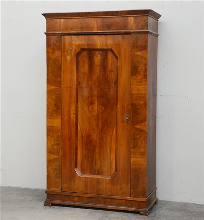 Piccolo armadio parzialmente radicato con un battente riquadrato e piedi a mensola (cm 103x182x49) (difetti)