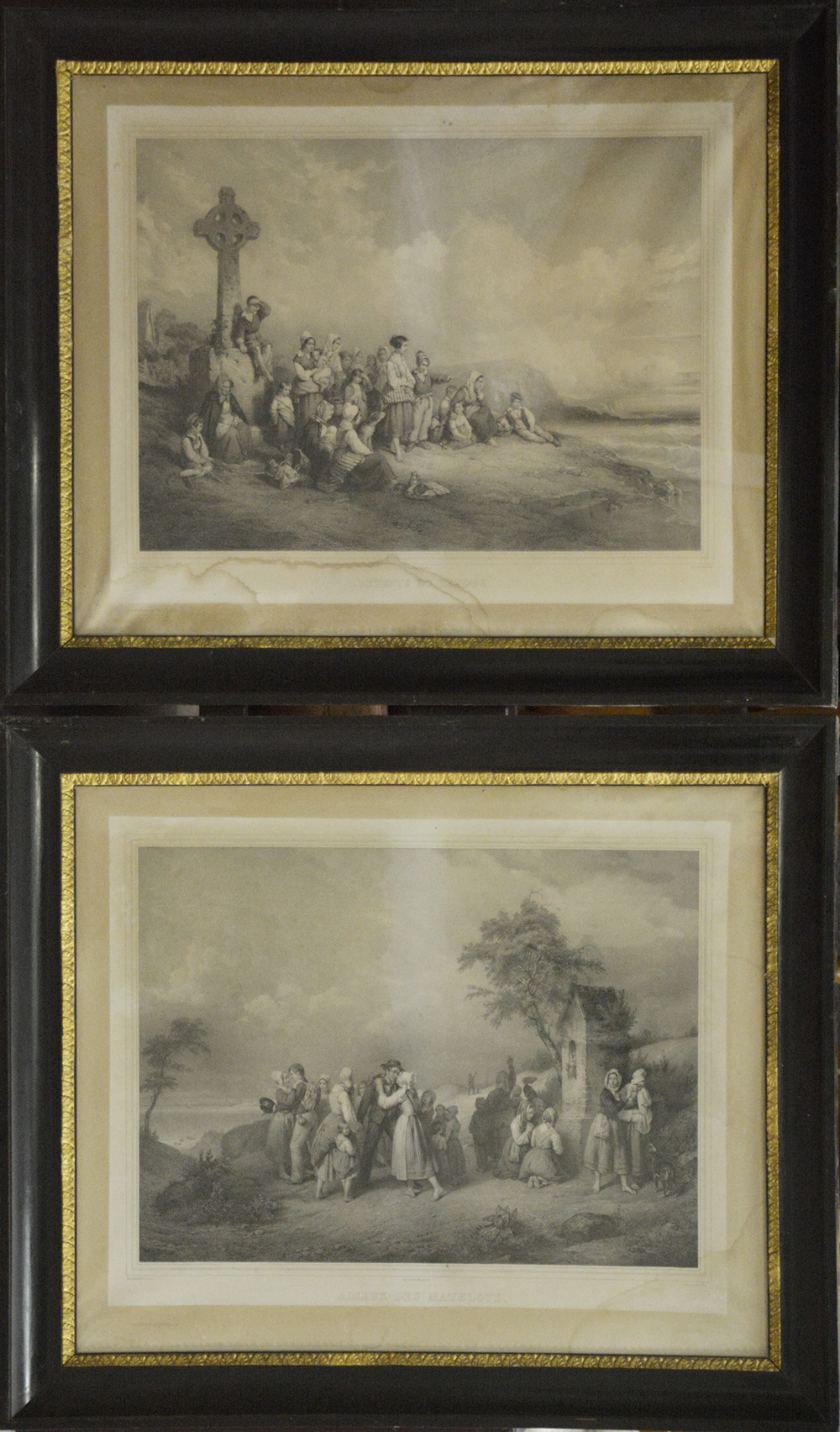 Coppia di incisioni francesi del secolo XIX raffiguranti scene di vita popolare (cm 60x74) in cornici dell'epoca in legno ebanizzato con profilo dorato (difetti)