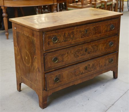 Piccolo comò lastronato in noce e filettato in legno chiaro, fronte a tre cassetti decorati da riserve in radica ed intarsiati a racemi floreali, secolo XIX (cm 116x85x56)(difetti)