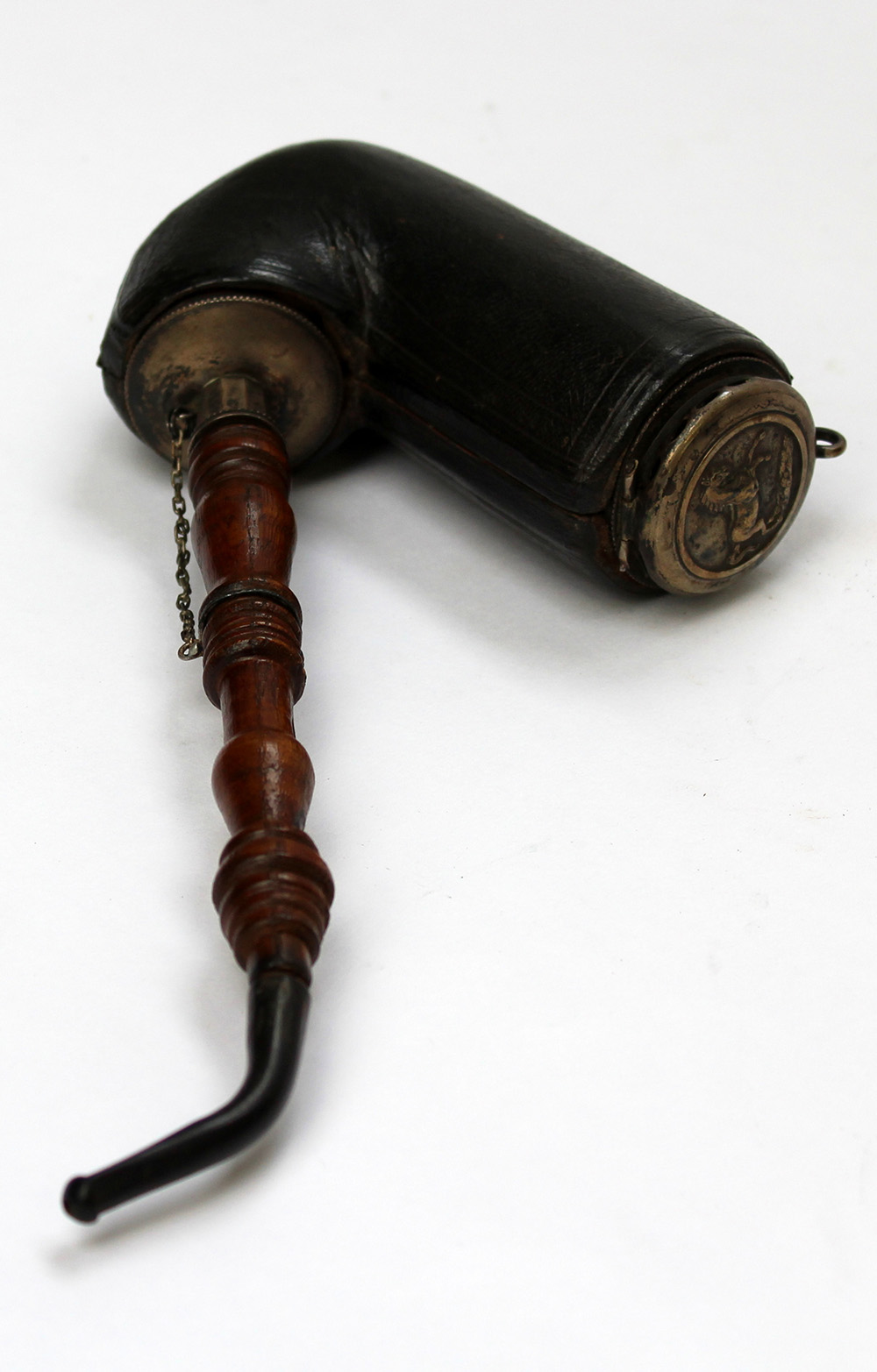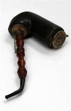 Pipa in schiuma con beccuccio in legno tornito e coperchio in metallo decorato con cavallo. Secolo XIX (cm 20) In custodia (difetti)