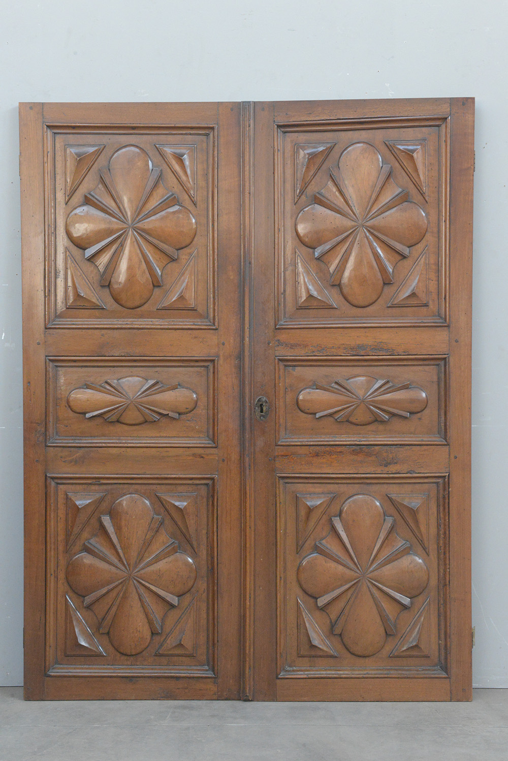 Porta a due ante in noce decorate a riquadri e pannelli quadrilobati scolpiti. Secolo XVIII (cm 174,5x65) (difetti)
