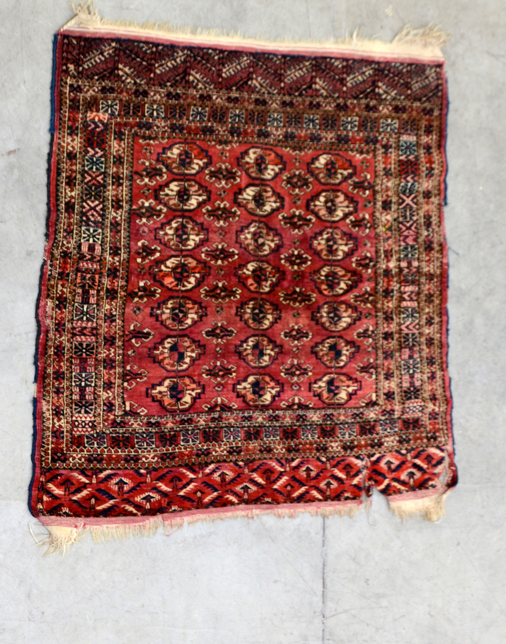 Tappeto Bouhkara, Turkestan occidentale. Disegno a Gul su fondo rosa (cm 99x94) (gravi difetti)