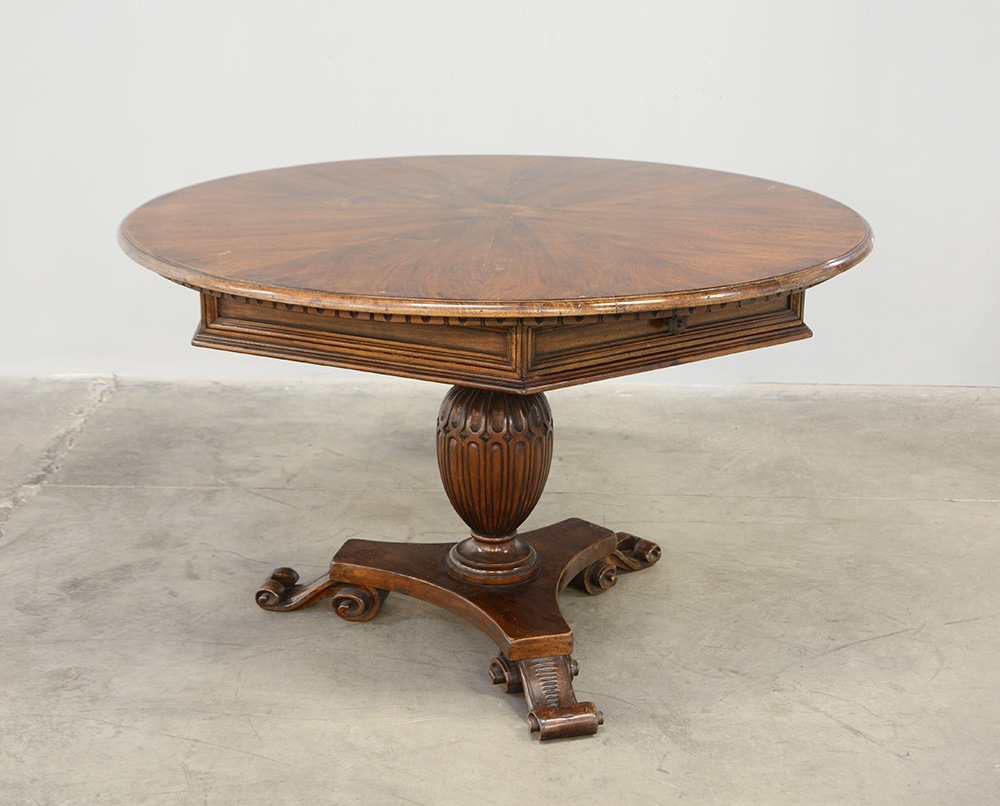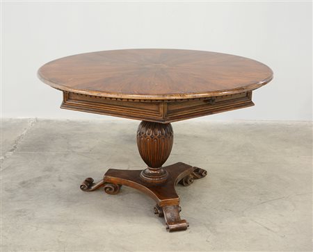 Tavolo tondo con sostegno a colonna su base tripode e due cassetti nella fascia (d cm 125, h cm 78) (difetti)