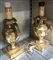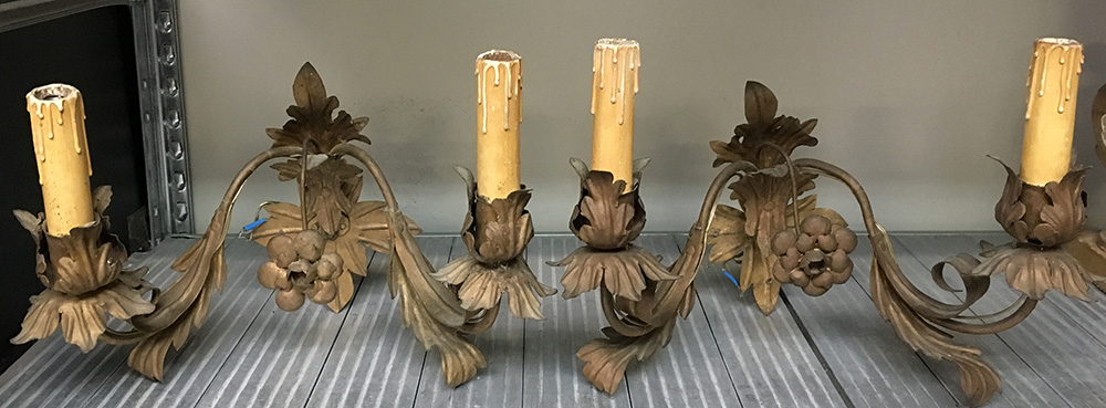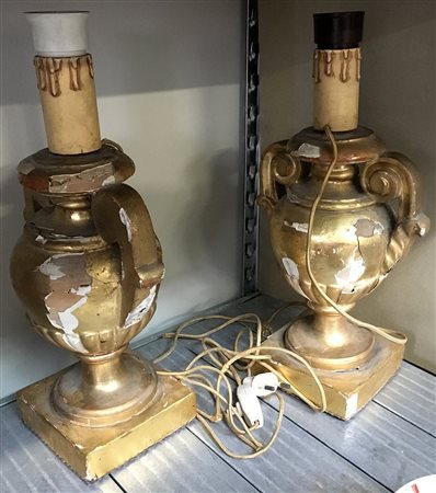 Lotto composto da una coppia di portacandele in legno dorato decorati a vaso biansato, montati a luce elettrica (h cm 33) e una coppia di appliques in metallo dorato decorate a motivi fogliacei (gravi difetti e mancazne)