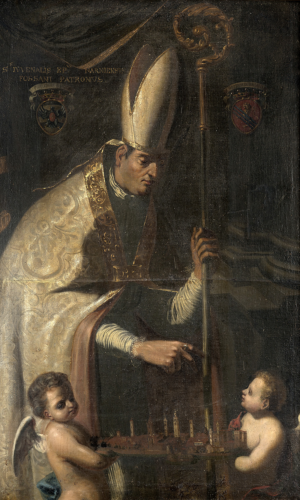 Saint Juvenal of Narni and two putti holding Fossano city model