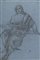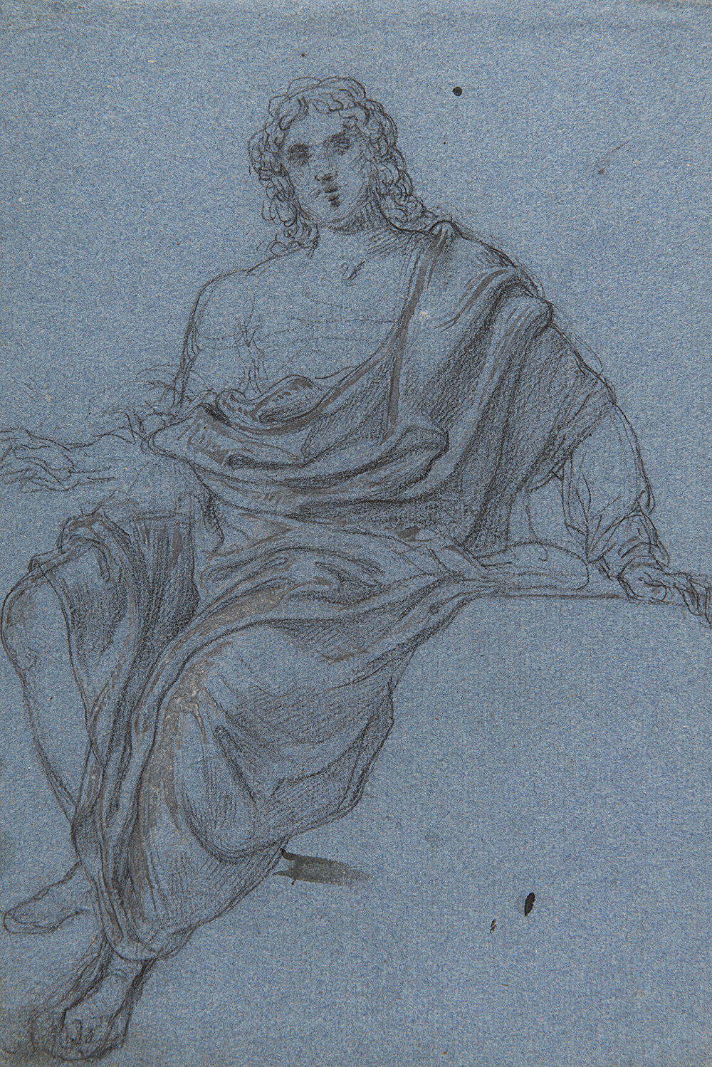 Scuola francese degli inizi del XIX secolo "Figura virile panneggiata seduta" (recto) "Studio di panneggio" (verso) carboncino e acquerello bruno mm 278x185. Al verso timbro di collezione non individuato (lievi difetti)