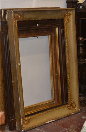Cornice a cassetta in legno laccato verde con profilo interno e angolari intagliati e dorati a palmette, secolo XIX (battuta cm 82x115)(difetti)