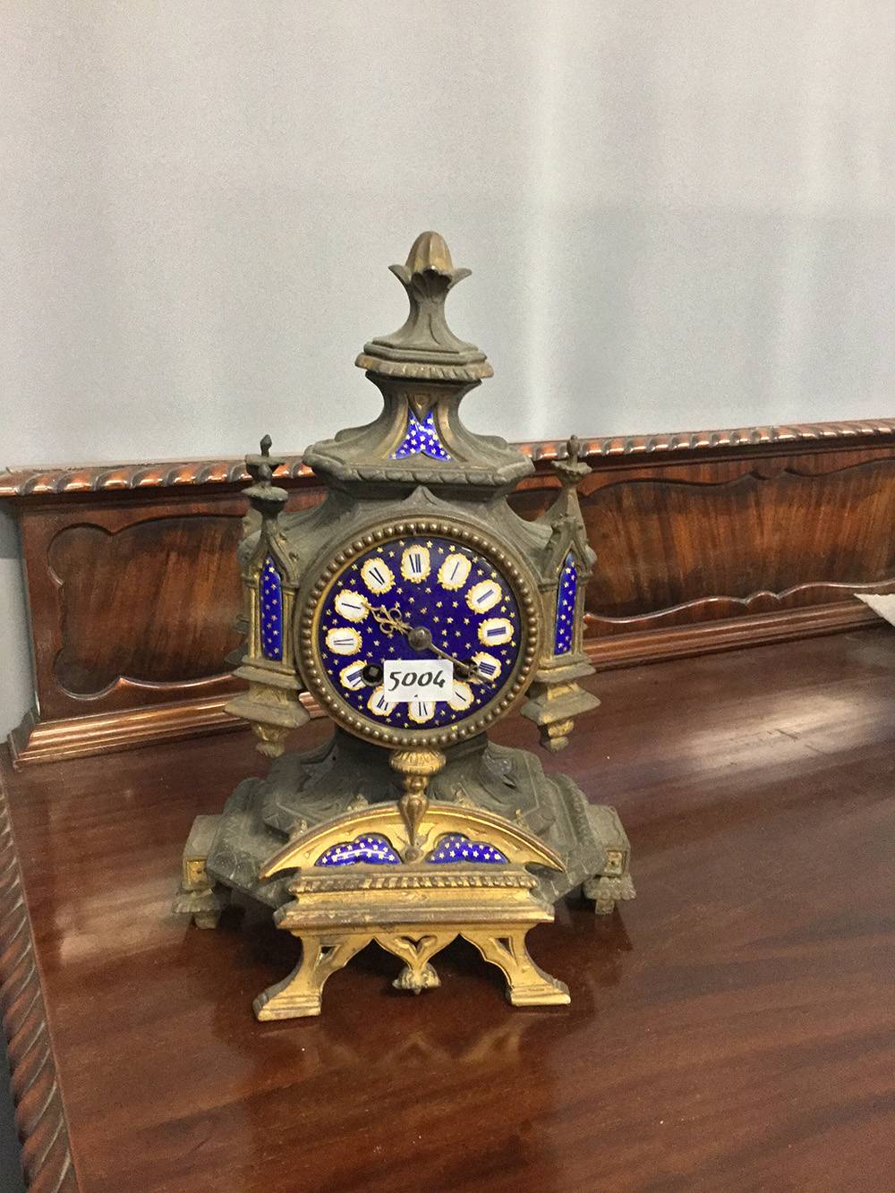 Pendola da tavolo in metallo dorato cesellato in stile neogotico decorata da placche in smalto blu e oro, quadrante a numeri romani, movimento con carica settimananle, suoneria delle ore e delle mezze su campanello, fine del secolo XIX (H cm 32)(difetti e mancanze)