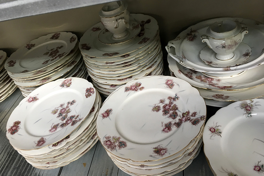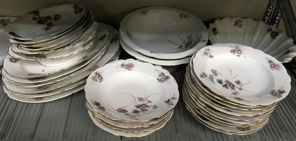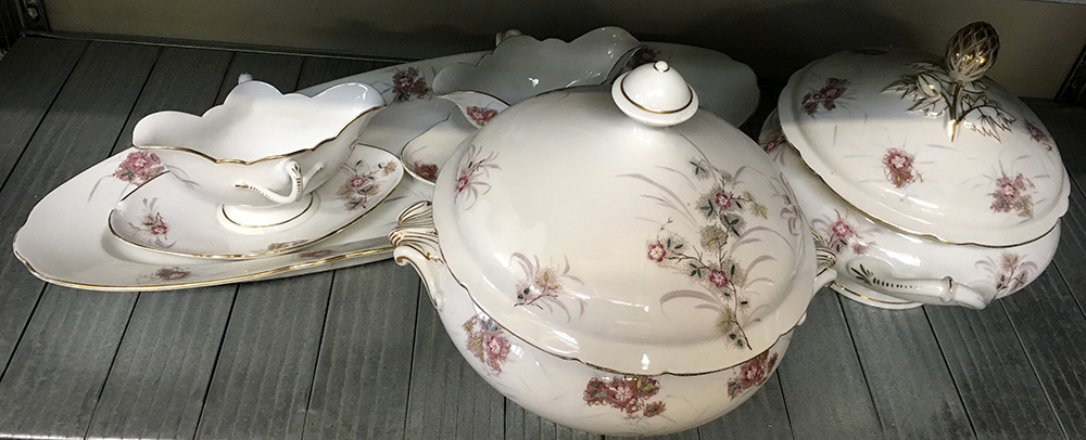 Due parti di servizi di piatti in ceramica bianca decorati in policroia a fiori e con profilo in oro, composto da numerosi piatti piani, piatti fondi, insalietiere e zuppiere (difetti)