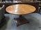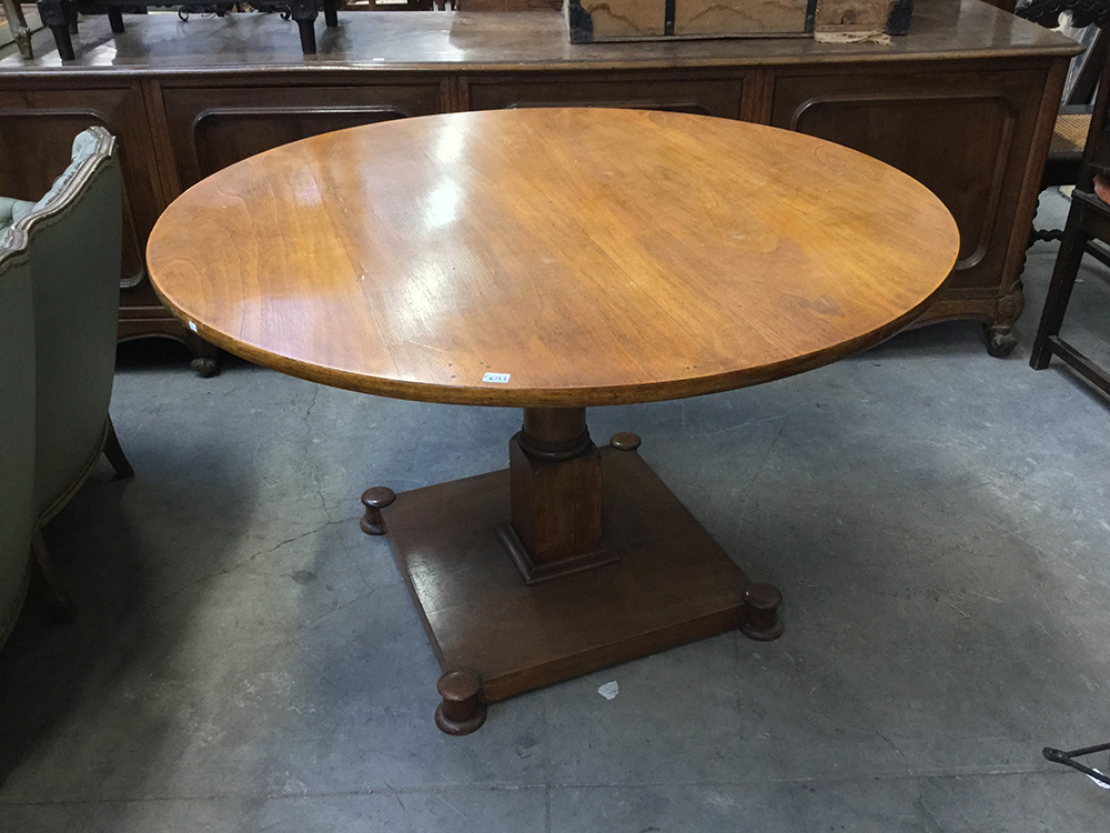 Tavolo con piano tondo, gamba centrale tornita, poggiante su base squadrata (d cm 118 x h cm 73) (difetti)