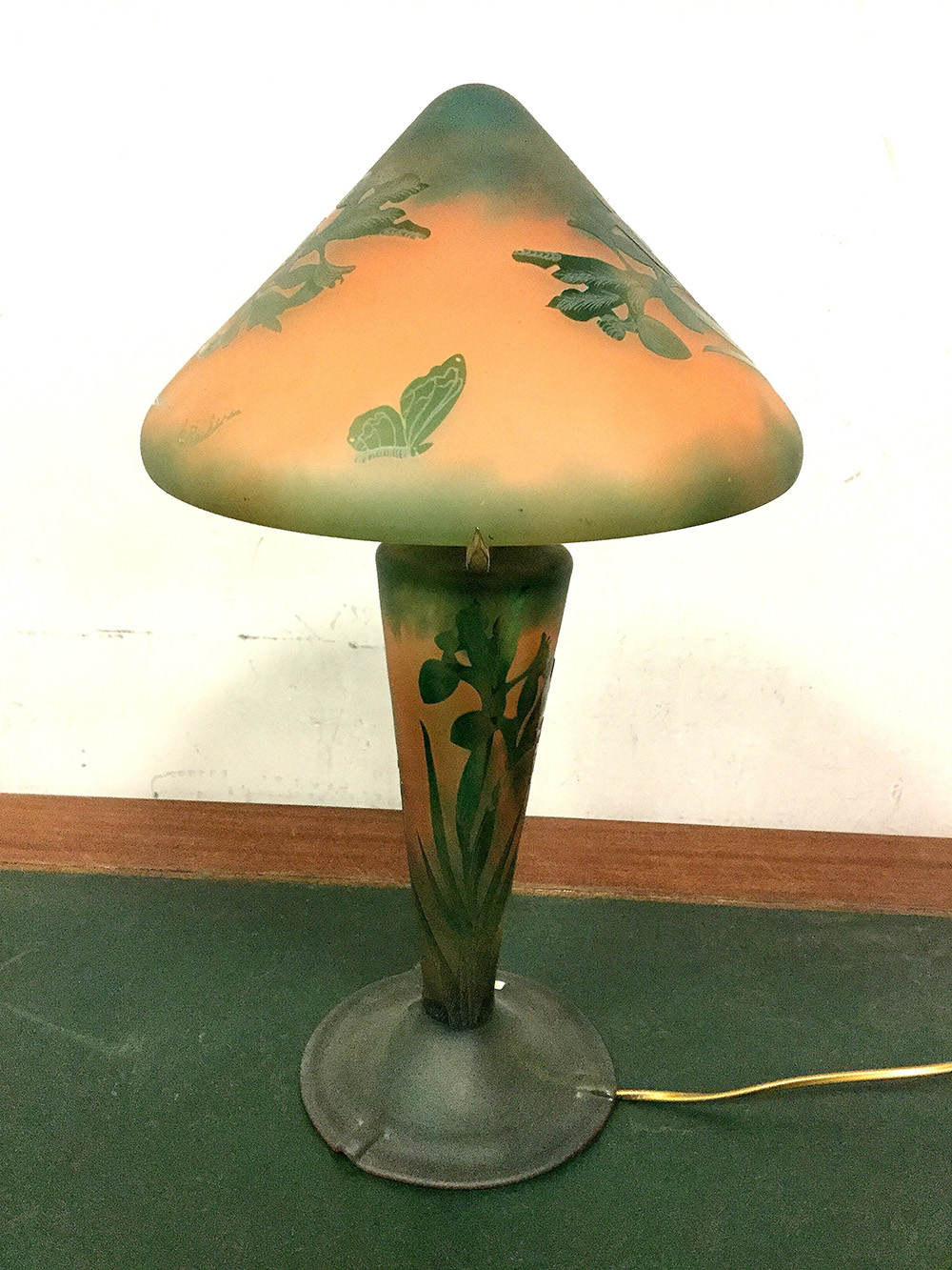 Lampada da tavolo in vetro cammeo a decori naturalistici nei toni del verde e arancio. Epoca recente. (h cm 44) (difetti)