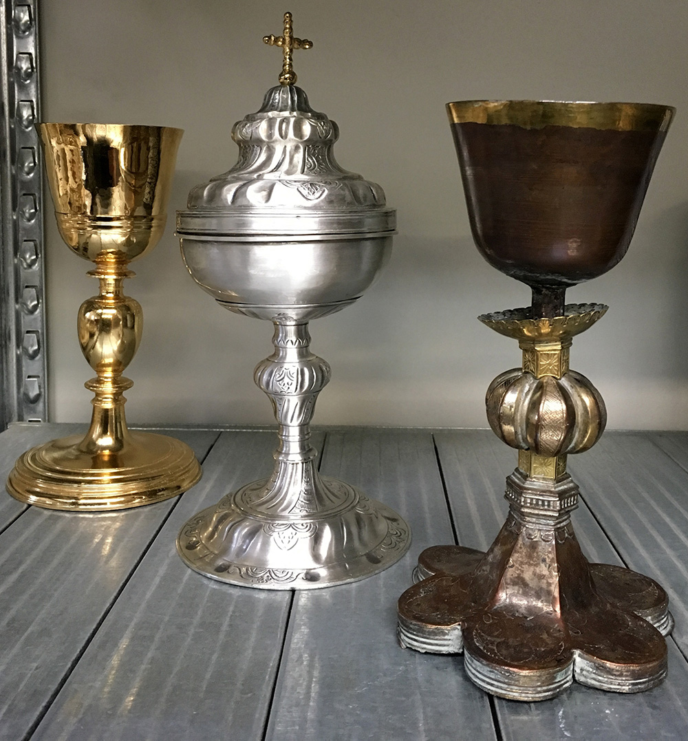 Lotto composto da due calici e un porta ostie in metallo, decori e misure diverse (difetti)