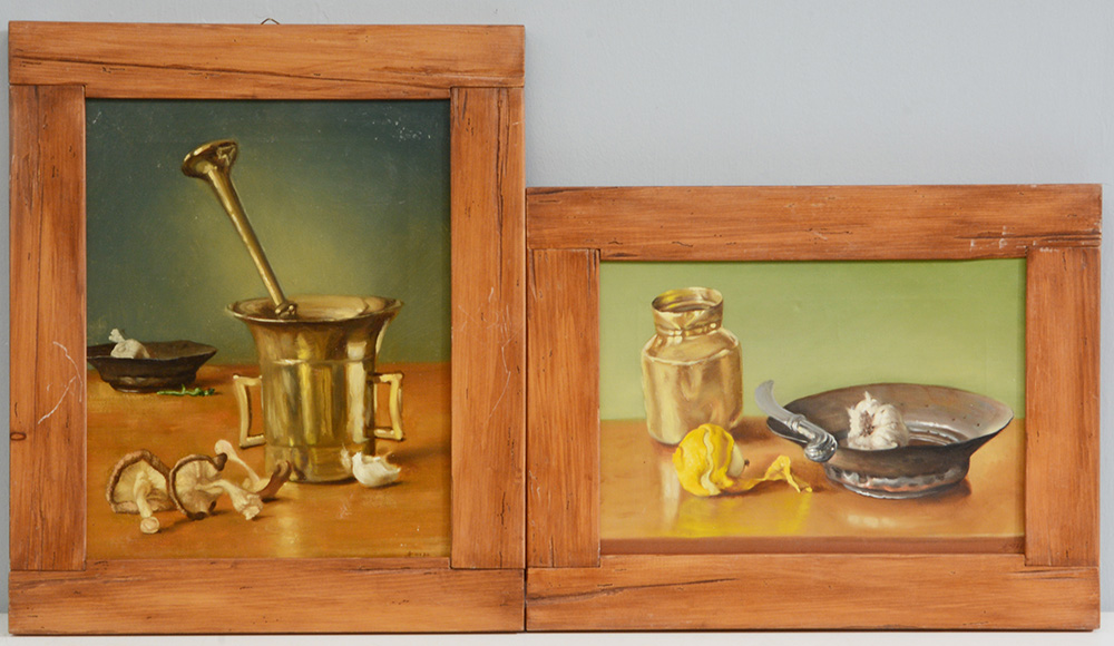 Firma indecifrata. Coposizioni con verdura, frutti e oggetti. Due oli su tela. In cornici. Misure diverse.