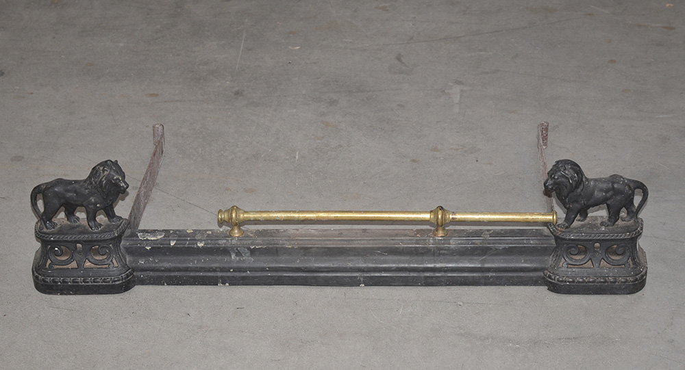 Ringhiera da camino in ghisa decorata alle estremità da leoni (l. cm 100) (difetti)