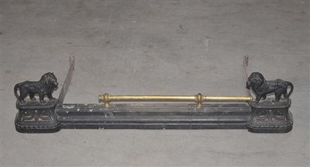 Ringhiera da camino in ghisa decorata alle estremità da leoni (l. cm 100)...