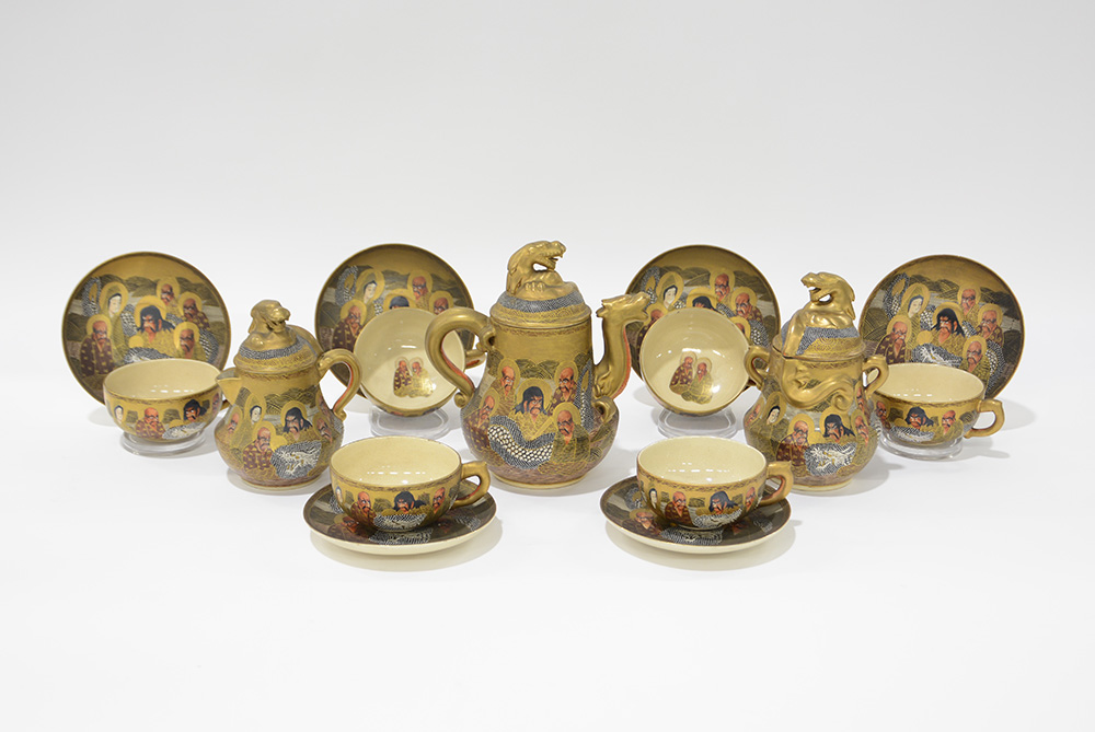 Servizio da tè in porcellana Satsuma a fondo dorato decorato in policromia a figure e dragoni (difetti)