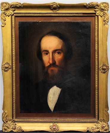 Scuola del secolo XIX "Ritratto di uomo con barba" olio su tela applicato a masonite (cm 40x31) In cornice dorata (difetti)
