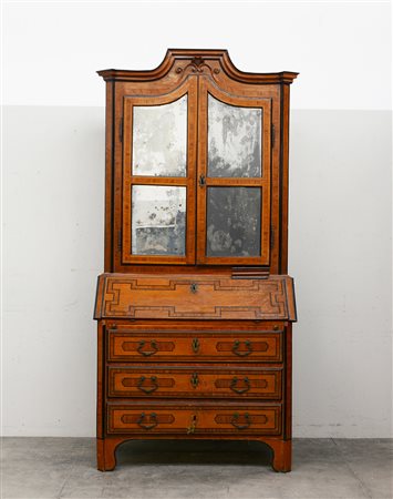 Trumeau con ribalta decorata da filettature e motivi geometrici ebanizzati. Parte inferiore a tre cassetti e superiore a due battenti con specchi. Secolo XIX (cm 110x233x50) (difetti e restauri)