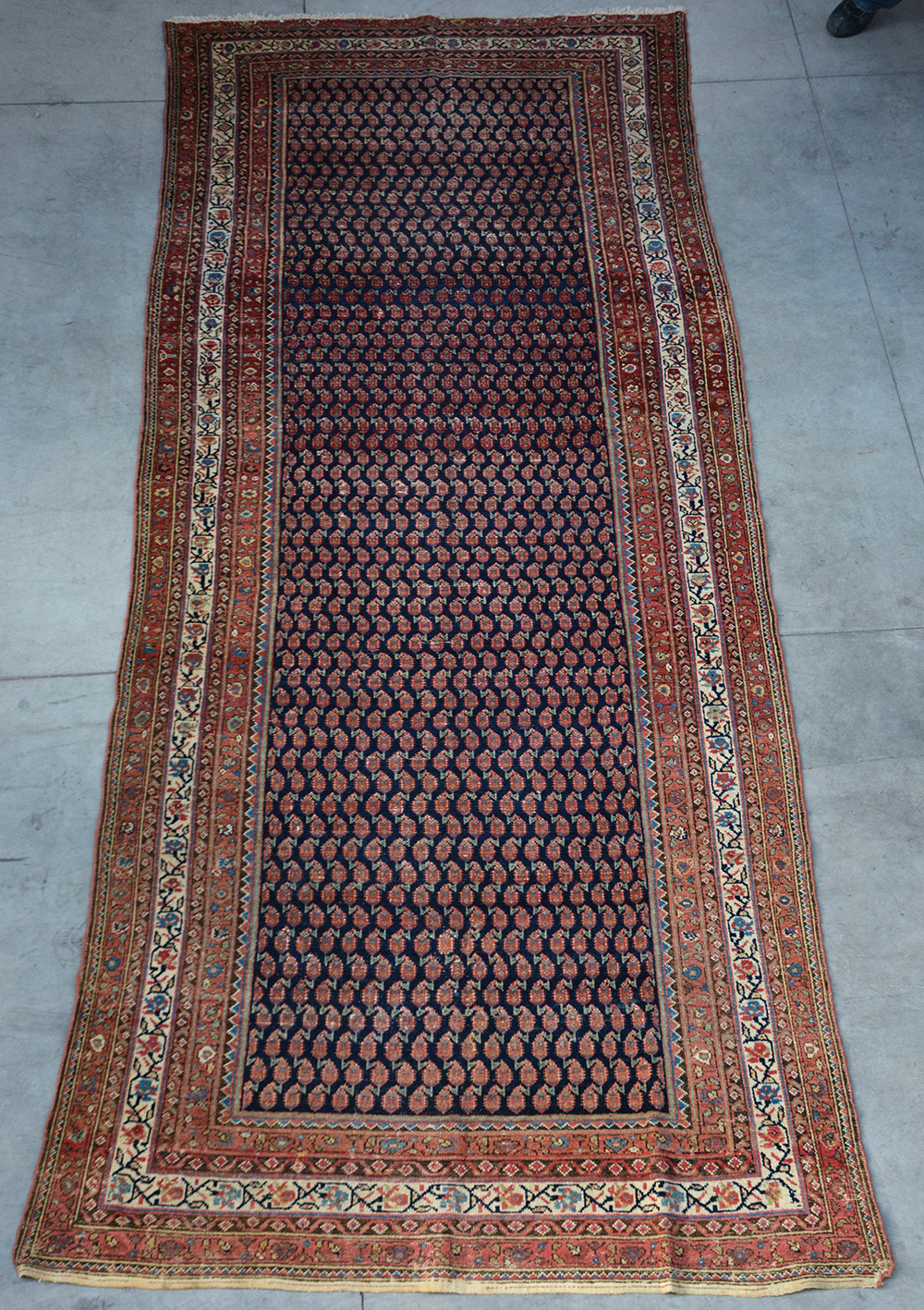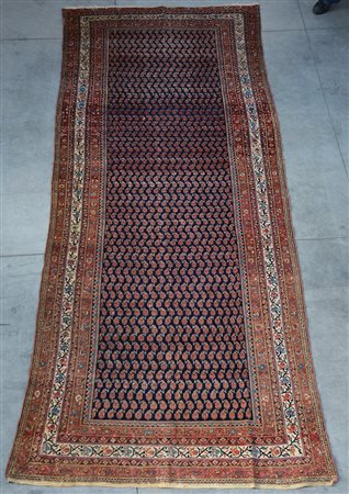 Tappeto Ferahkan, Persia, fine secolo XIX. Decoro a file di boteh su fondo blu, molteplici bordure (cm 408x170) (difetti)