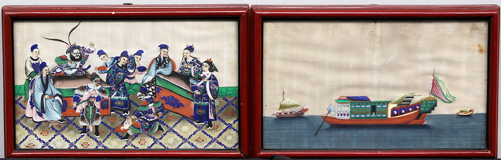 Due dipinti policromi su carta di riso raffiguranti personaggi e imbarcazioni, in cornice (cm 20x32)(difetti)