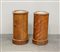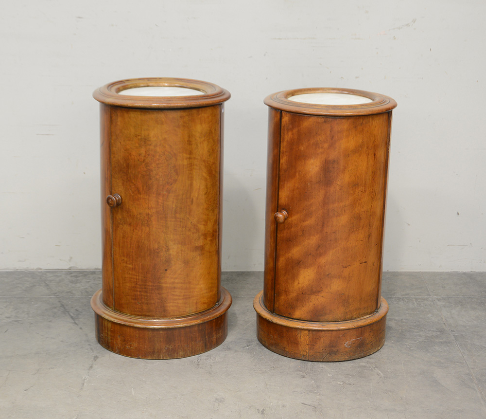 Coppia di comodini a colonna in noce con piani in marmo incassato (h cm 73, d cm 38) (difetti)