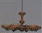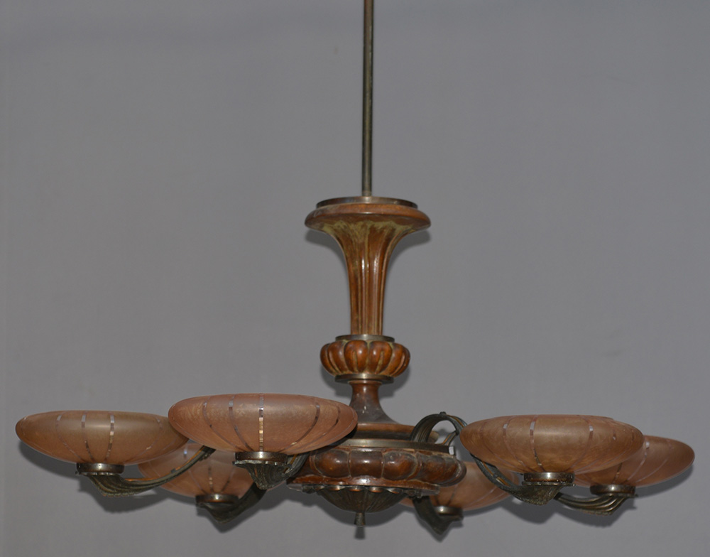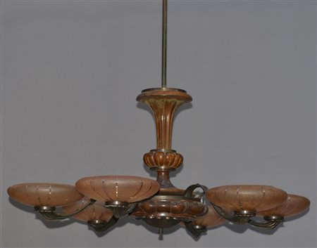 Lampadario in rame e legno a sei luci con copriparalumi in vetro rosa acidato. Secolo XX.