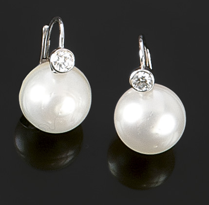 COPPIA DI ORECCHINI Coppia di orecchini in oro bianco con due perle australiane del diametro da mm 13,8 a 14,13 ca, e due diamanti taglio brillante rotondo per complessivi ct 0,50 ca Peso gr. 11,8