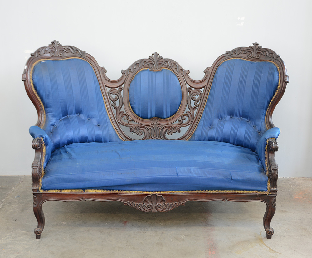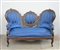 Divano a tre posti in noce con sedute sagomate e cimase intagliate. Rivestito in raso blu. Secolo XIX (largh. cm 163) (difetti)