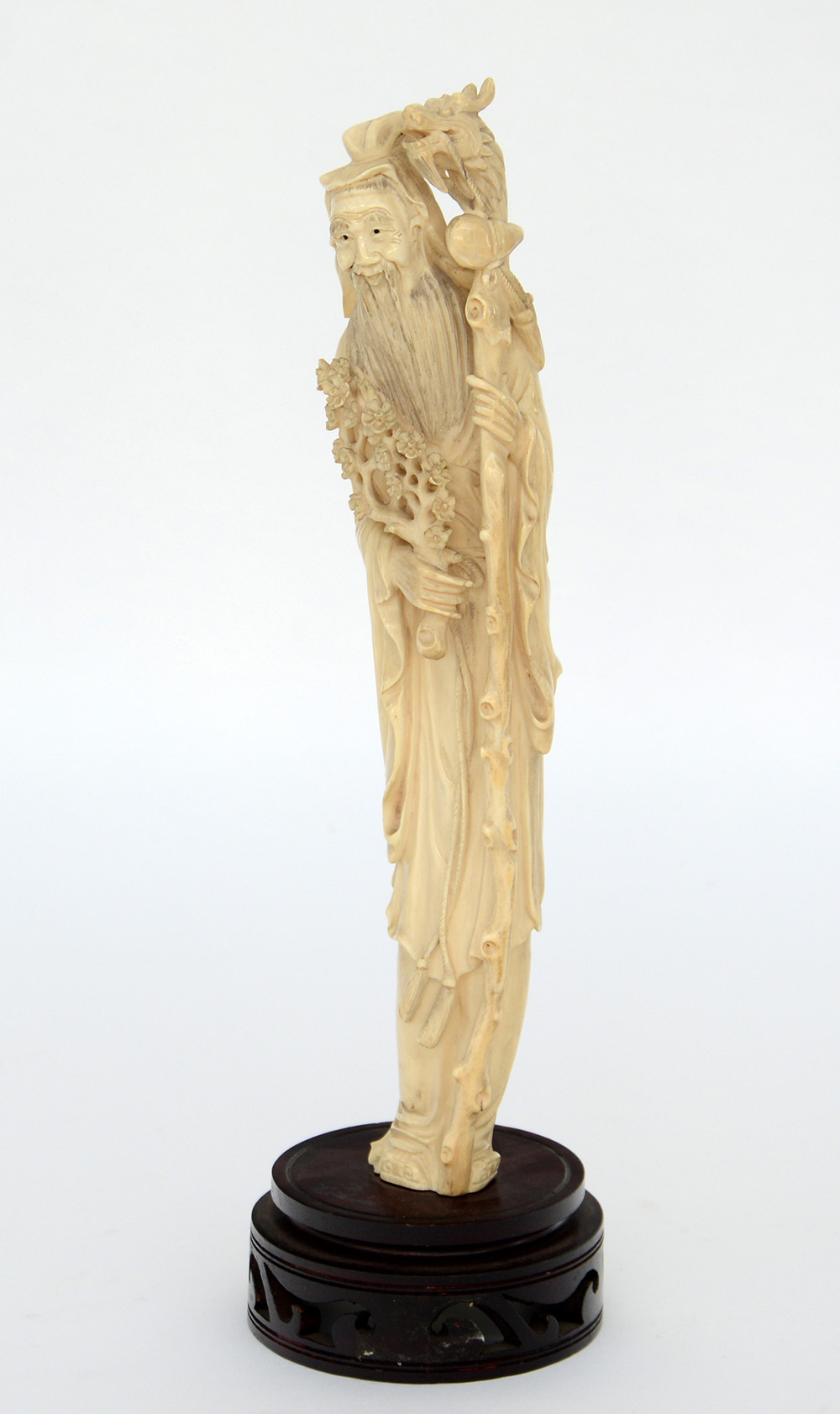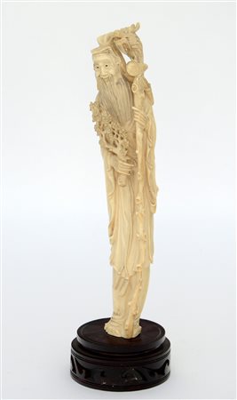 Monaco con ramo e fiore, base in legno (h. 31 cm.)(difetti)Cina, inizio sec....
