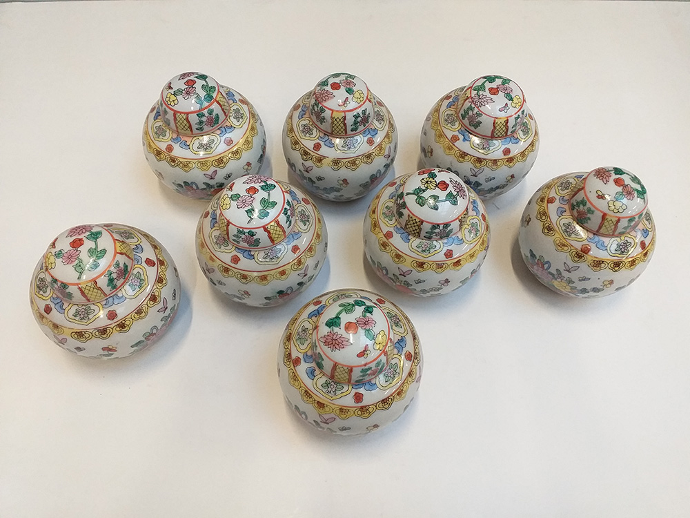 Otto piccole potiches con coperchio in porcellana policroma (h. cm 11) (lievi difetti)