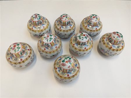 Otto piccole potiches con coperchio in porcellana policroma (h. cm 11) (lievi...