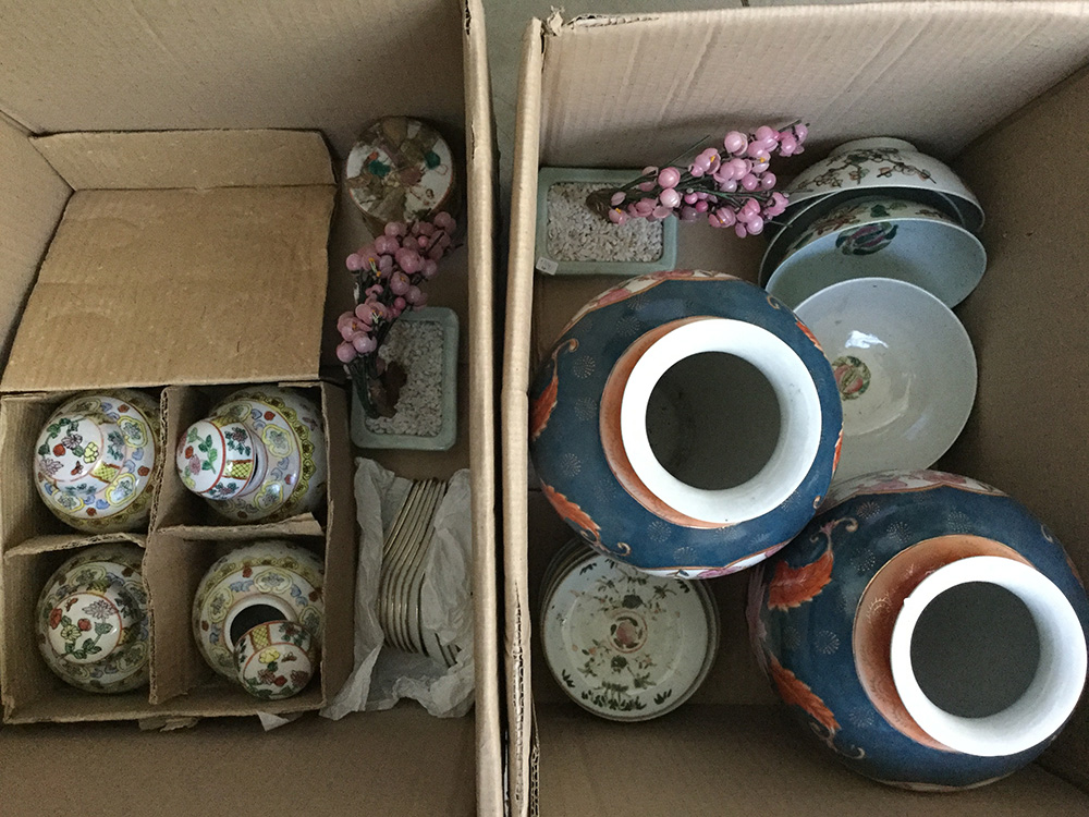 Due scatole contenenti oggetti di manifattura cinese tra cui: dodici cucchiaini in porcellana, due vasi in porcellana policroma, otto piattini in porcellana, cinque ciotole, un portaunguenti, due piante rosa e quattro potiches policrome (difetti)