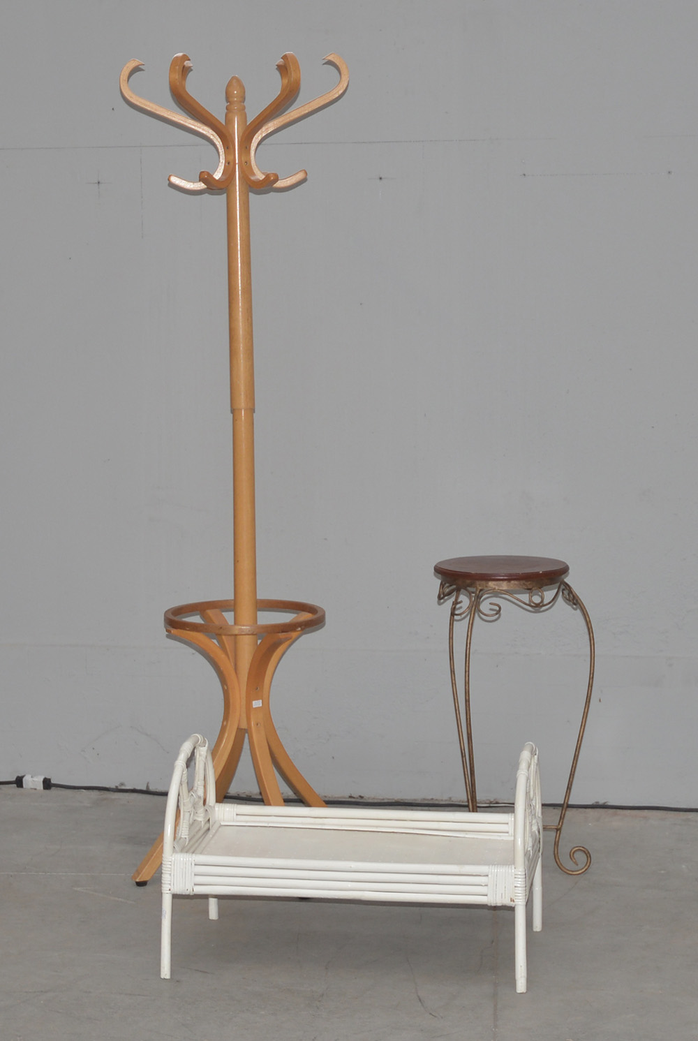 Lotto composto da un appendiabiti, un tavolino con base in ferro dorato e un vassoio da letto (difetti)
