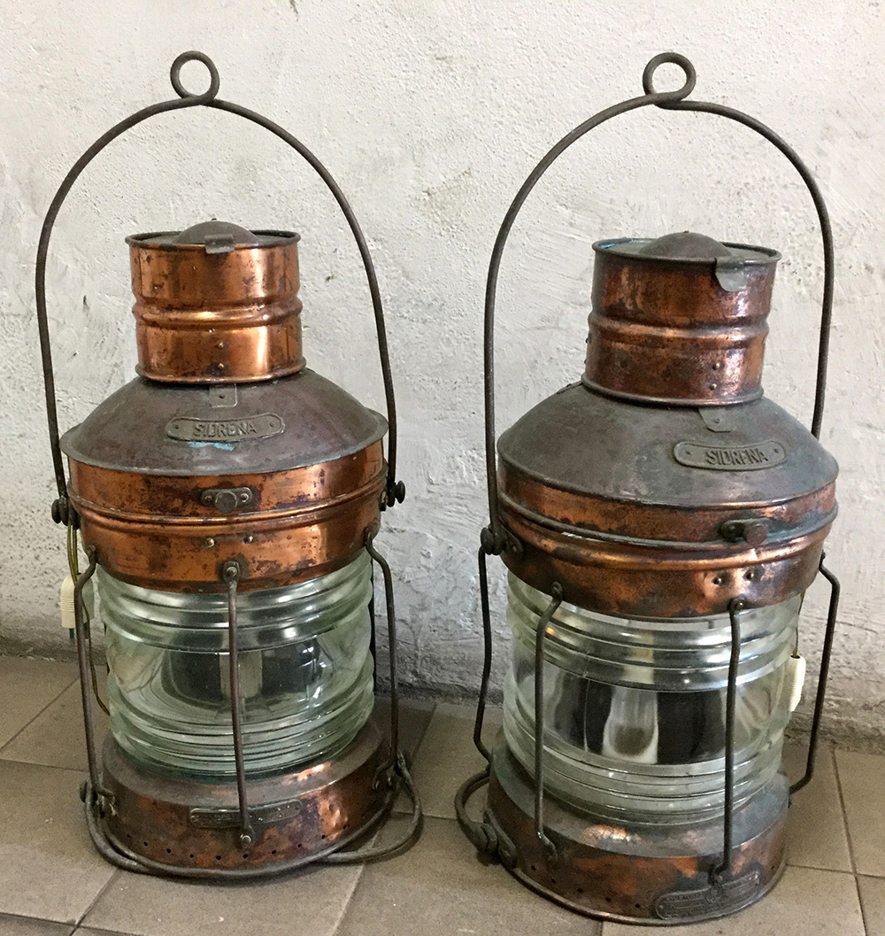 Coppia di lanterne nautiche da ancoraggio in rame e vetro, montate a luce elettrica in epoca posteriore (h cm 50) (difetti)