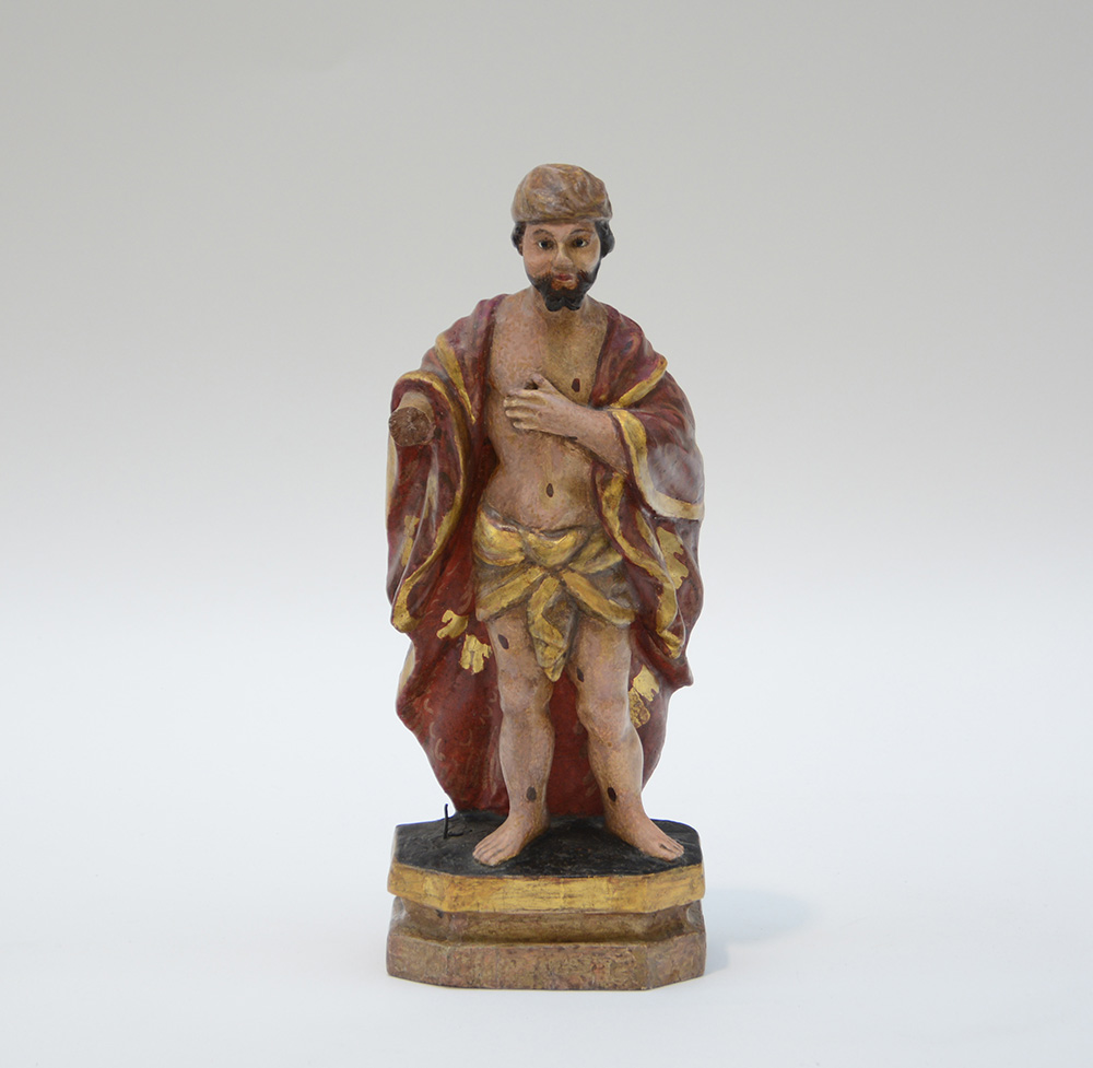 Scultura in legno intagliato e dipinto raffigurante un santo (h cm 28) (difetti e mancanze)