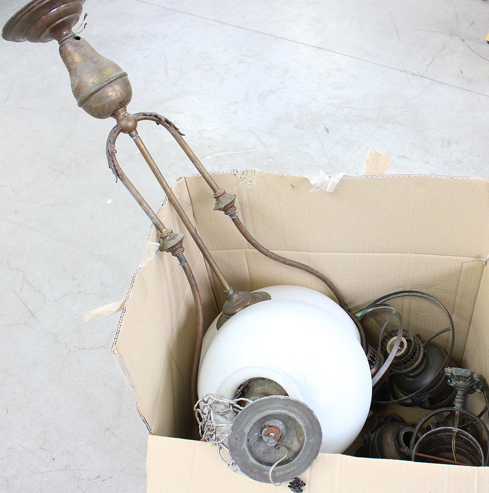 Cartone contenente numerosi pezzi di lampadari e lampade
