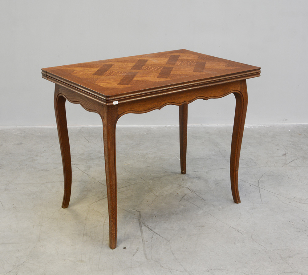 Tavolo da gioco in rovere con piano decorato a rombi e gambe mosse (cm aperto...