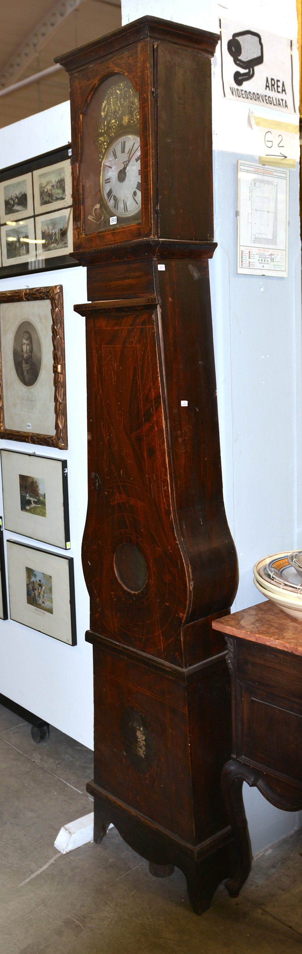 Orologio a torre con cassa in legno laccato, movimento con carica settimanalesuoneria delle ore e delle mezze con botta e ribotta, sveglia, quadrante in smalto bianco con numeri romani. Secolo XIX (h. cm 230) (difetti)