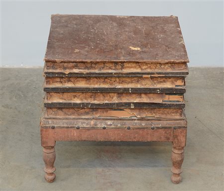 Curiosa comoda decorata a finti libri con gambe tornite. Secolo XIX (cm 43x46x35) (difetti)