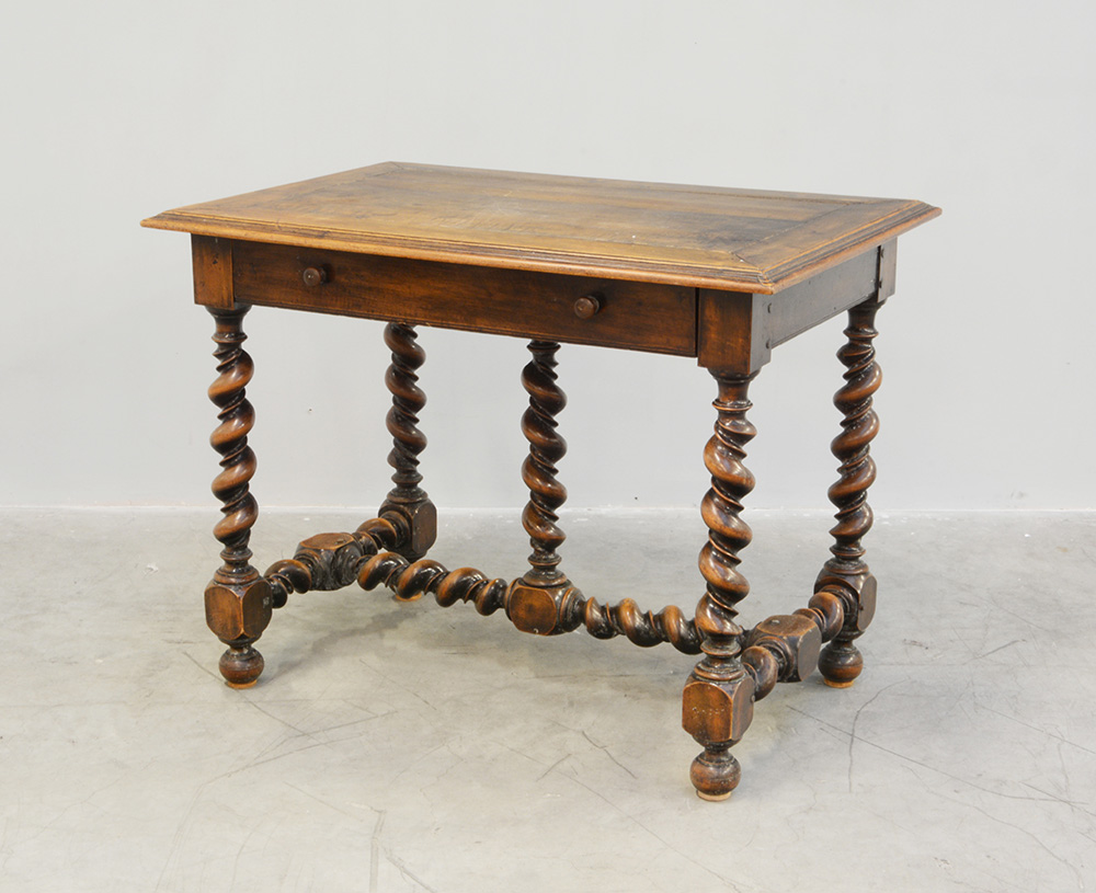 Tavolo scrittoio ad un cassetto nella fascia con gambe e traverse a torciglioni (cm 101x76x67) (difetti)