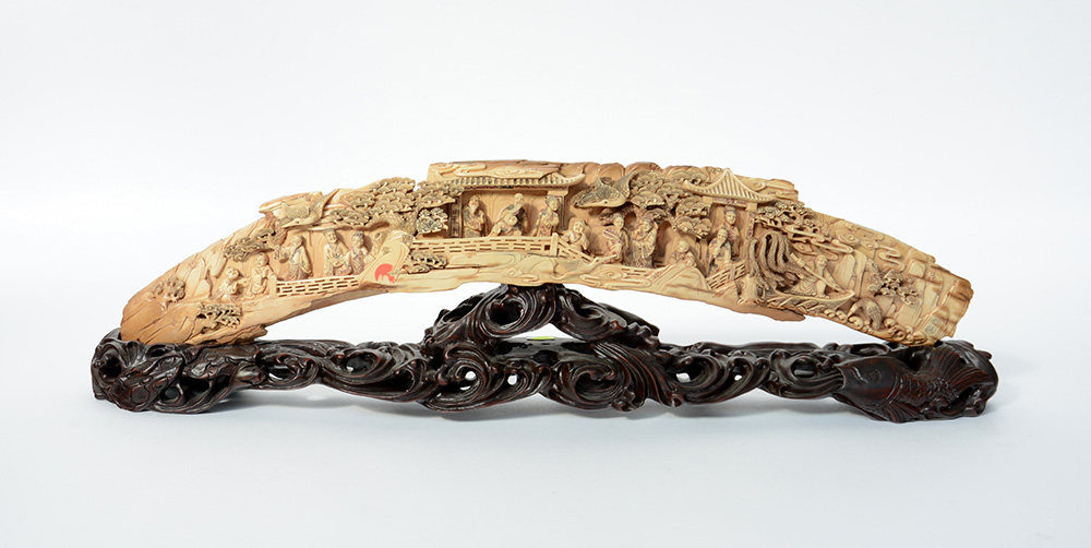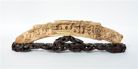 Sezione di zanna in avorio fossile con figure in paesaggio e padiglioni, con base in legno (l. 64 cm.)(difetti)