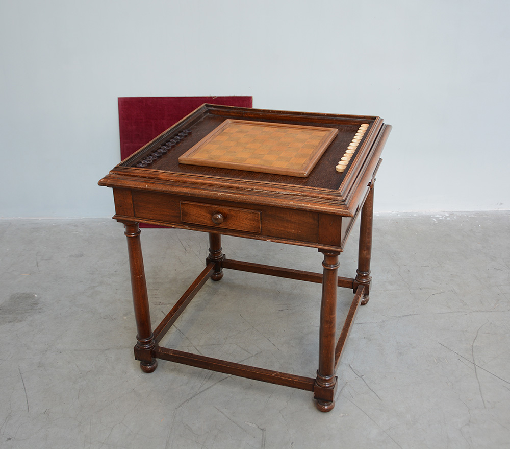 Tavolo da gioco con piano ribaltabile celante vano con scacchiera (cm 70x73x70) (difetti)