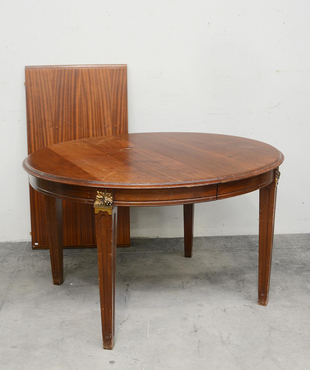 Tavolo ovale allungabile con gambe rastremate arricchite da placche in bronzo con foglie di quercia, e una prolunga (cm 125x74x110) (difetti)