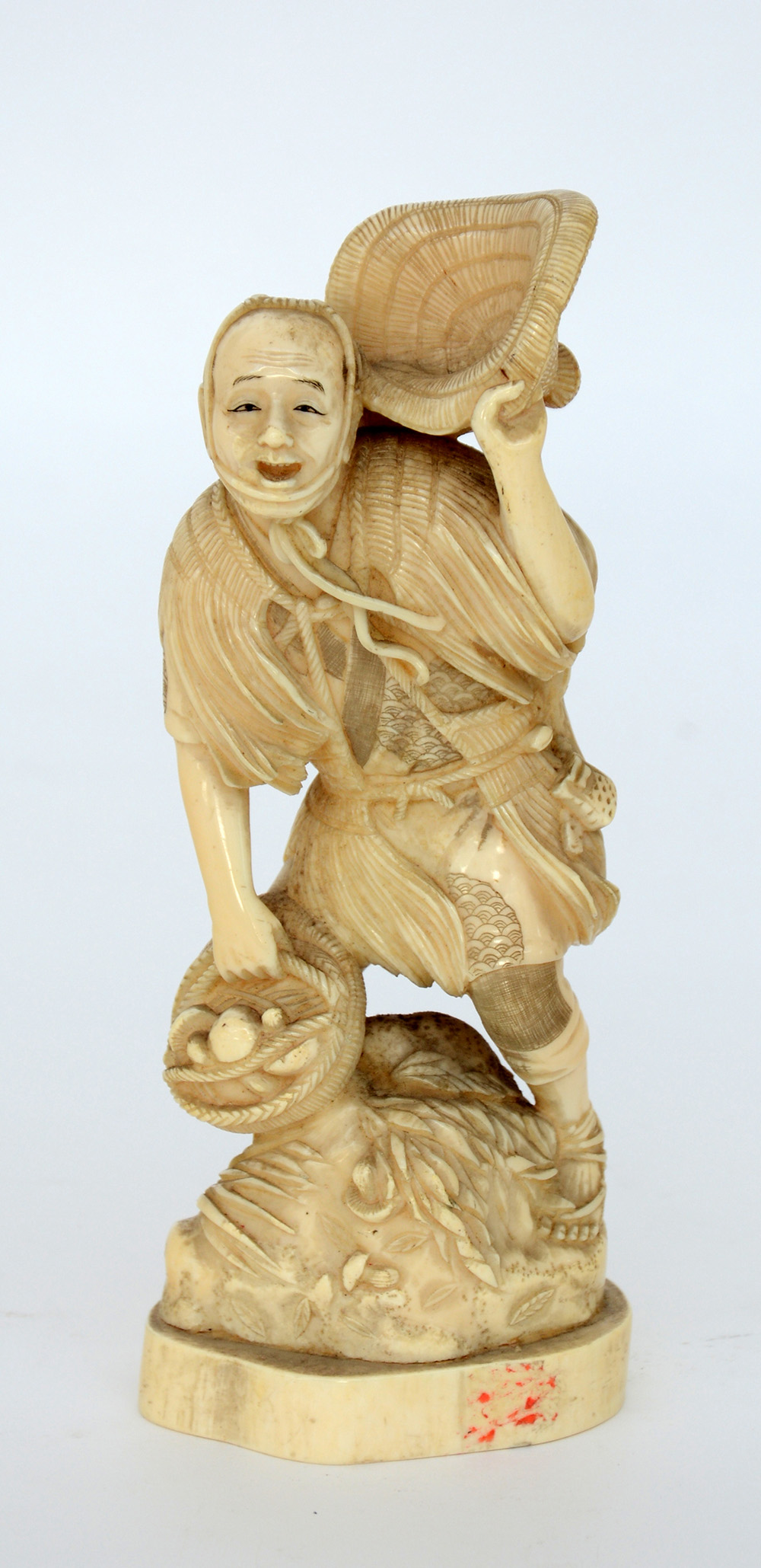 Okimono in avorio raffigurante cercatore di funghi con cappello e cestino (h. 19 cm.) (difetti)